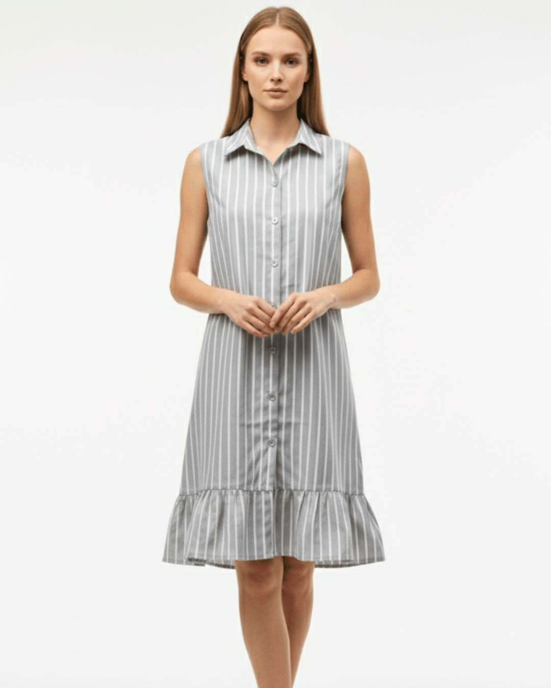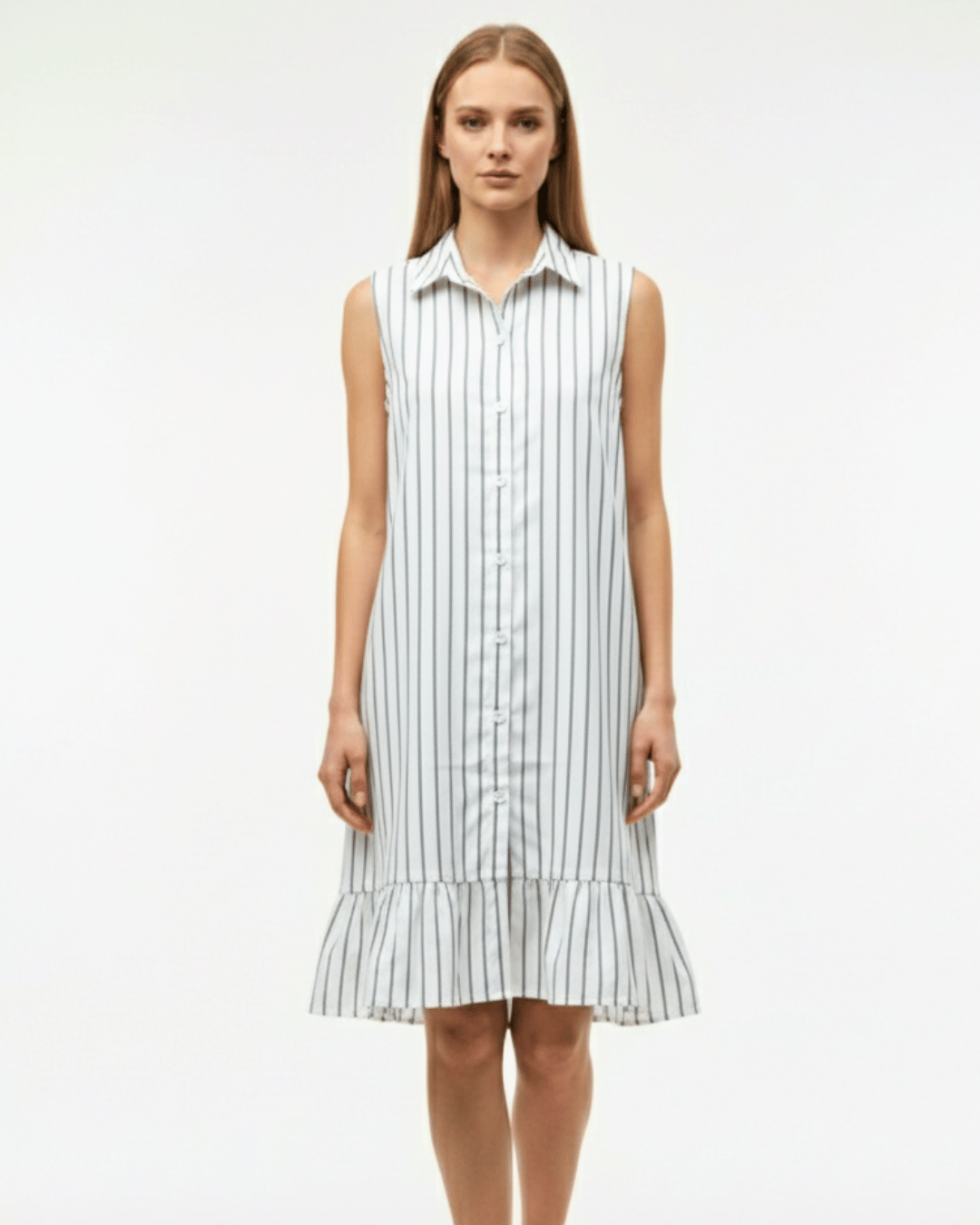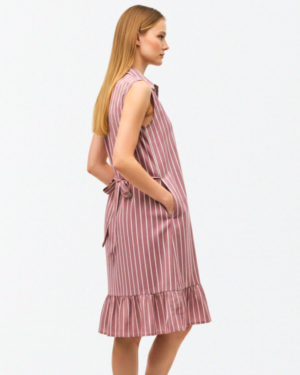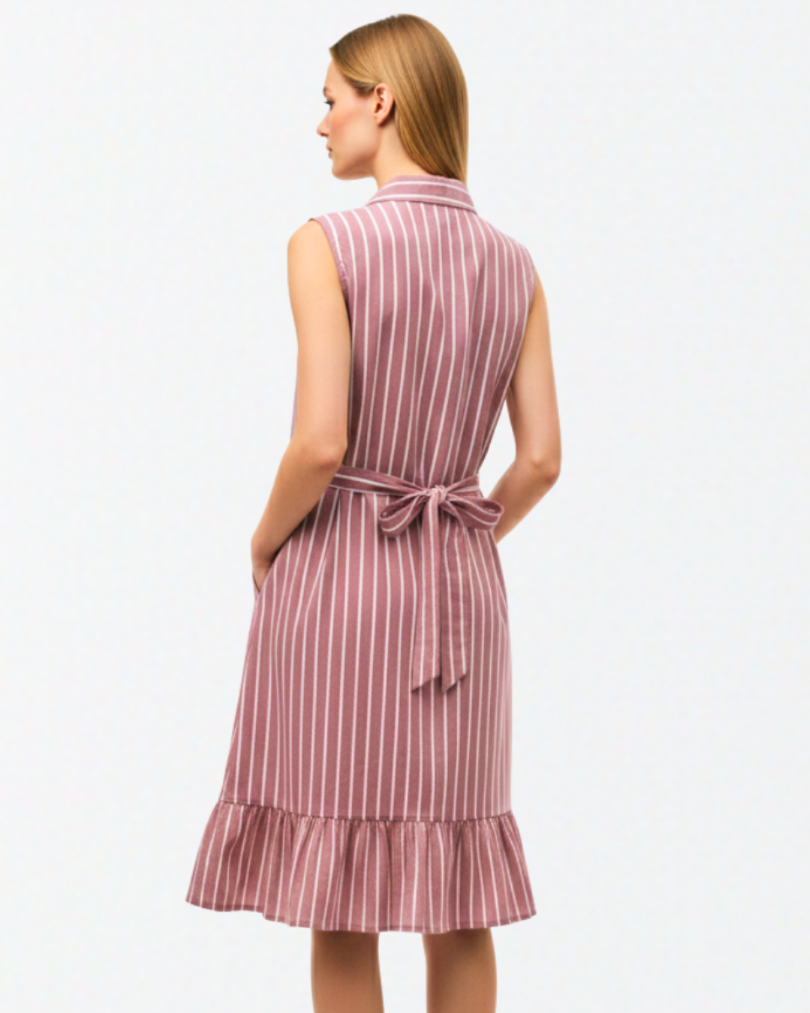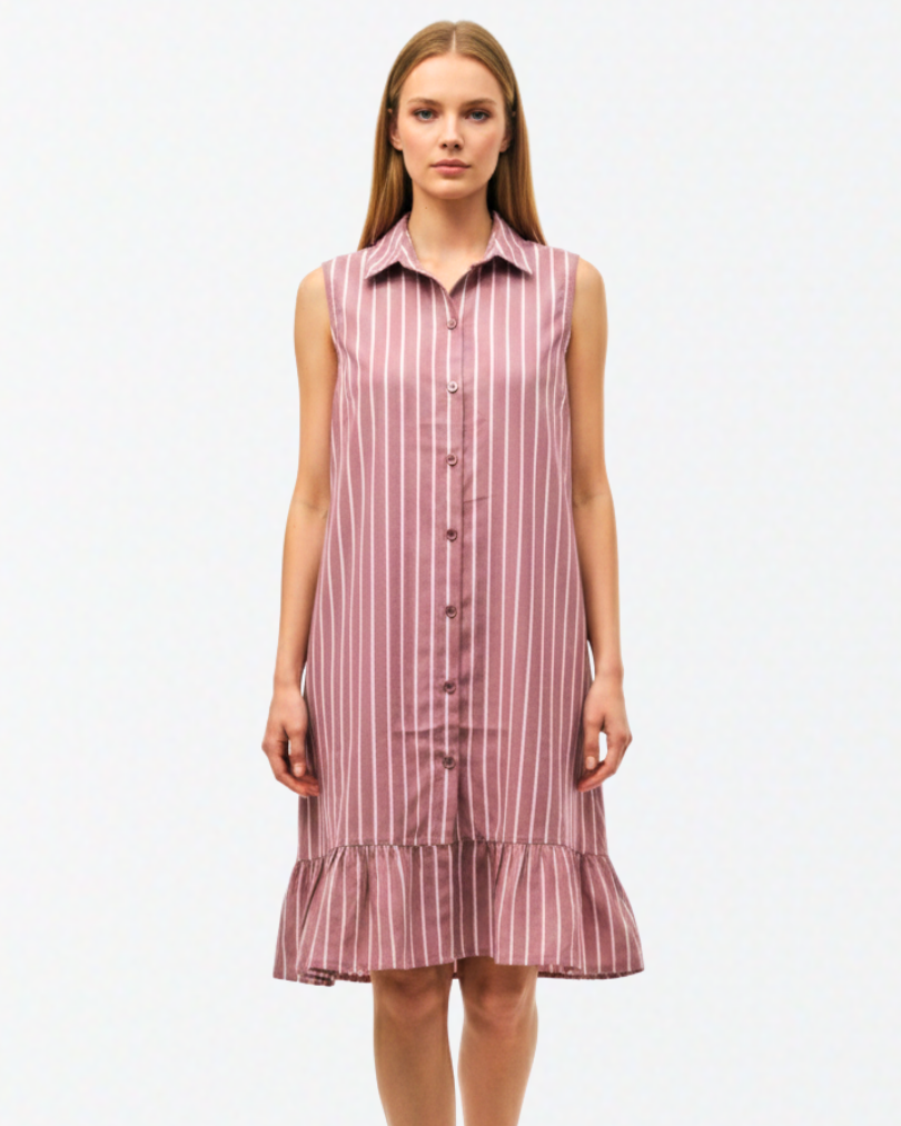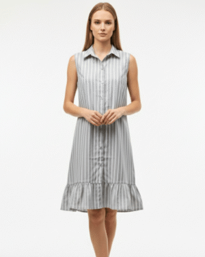 Elevate her everyday wardrobe with this charming and breathable sleeveless shirt dress. Designed with a timeless vertical pinstripe pattern, this frock features a classic button-down front and a smart pointed collar. The relaxed shift silhouette is beautifully balanced by a feminine ruffled hem and an adjustable tie-back waist, allowing for a custom, comfortable fit. Whether it’s a family brunch or a sunny afternoon outing, this dress offers a perfect blend of polished style and playful ease.
